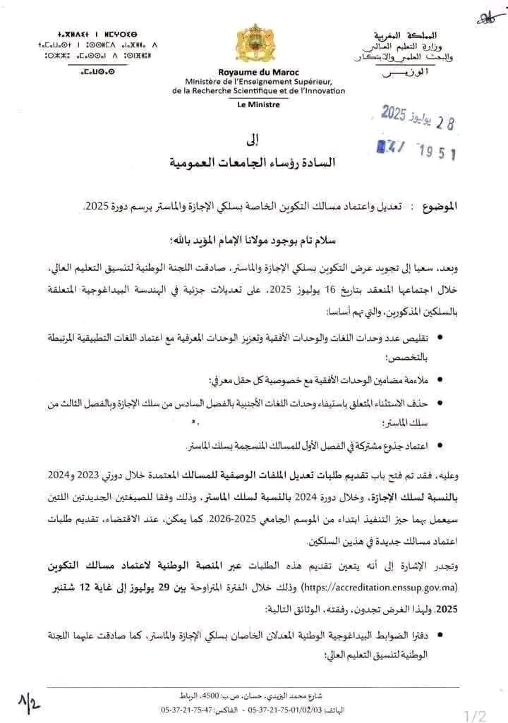 أصدرت وزارة التعليم العالي والبحث العلمي والابتكار مذكرة رسمية موجهة إلى رؤساء الجامعات العمومية، تحمل رقمًا مرجعيًا بتاريخ 28 يوليوز 2025، تعلن فيها عن مصادقة اللجنة الوطنية لتنسيق التعليم العالي على سلسلة من التعديلات البنيوية والبيداغوجية الجوهرية في سلكي الإجازة والماستر، وذلك ابتداءً من الموسم الجامعي المقبل 2025-2026.