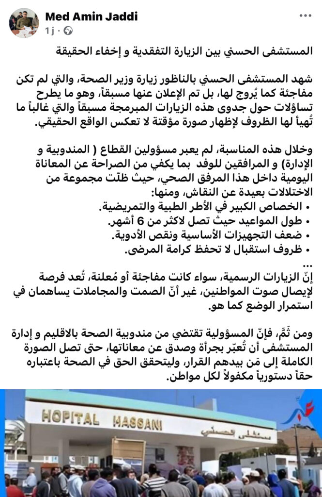 وختم جدي تصريحه بالتشديد على أنّ المسؤولية الأخلاقية والمؤسساتية تفرض على المندوبية الإقليمية وإدارة المستشفى التحلي بالجرأة والصدق في نقل صورة الواقع، بما يضمن أن تصل الرسالة واضحة إلى صانعي القرار، تحقيقاً لحق المواطنين في الصحة باعتباره حقاً دستورياً مكفولاً لكل مواطن.