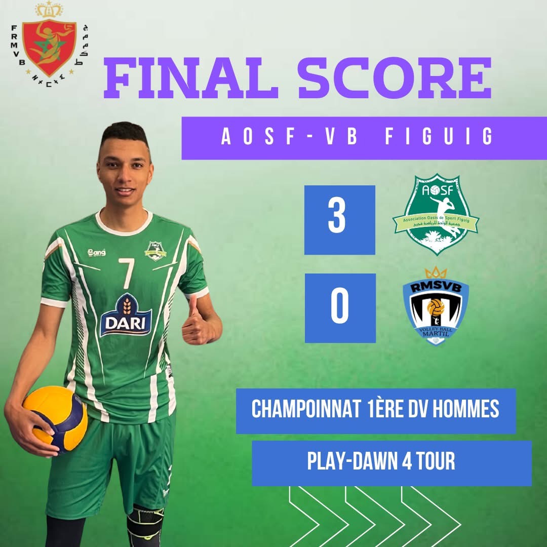 في إطار منافسات البطولة الوطنية للكرة الطائرة – القسم الأول رجال (بلاي داون)، برسم الدورة الرابعة إياب، حقق نادي الواحة للكرة الطائرة فوزاً مستحقاً على حساب نادي مارتيل بثلاثة أشواط دون مقابل (3-0).
