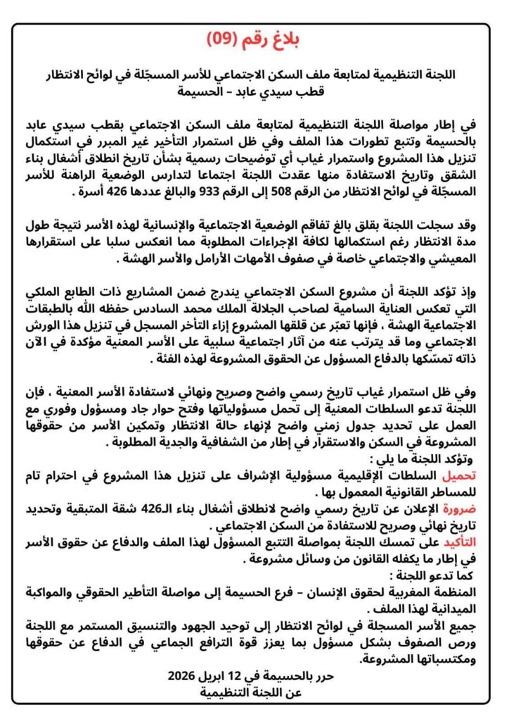 وأفادت اللجنة، في بلاغها رقم (09) الصادر بتاريخ 12 أبريل 2026، أنها عقدت اجتماعًا خصص لتدارس الوضعية الراهنة للأسر المعنية، والتي يتراوح ترتيبها بين الرقم 508 و933، ويبلغ عددها 426 أسرة، لا تزال تنتظر الاستفادة من السكن الاجتماعي رغم استيفائها لكافة الشروط والإجراءات المطلوبة.