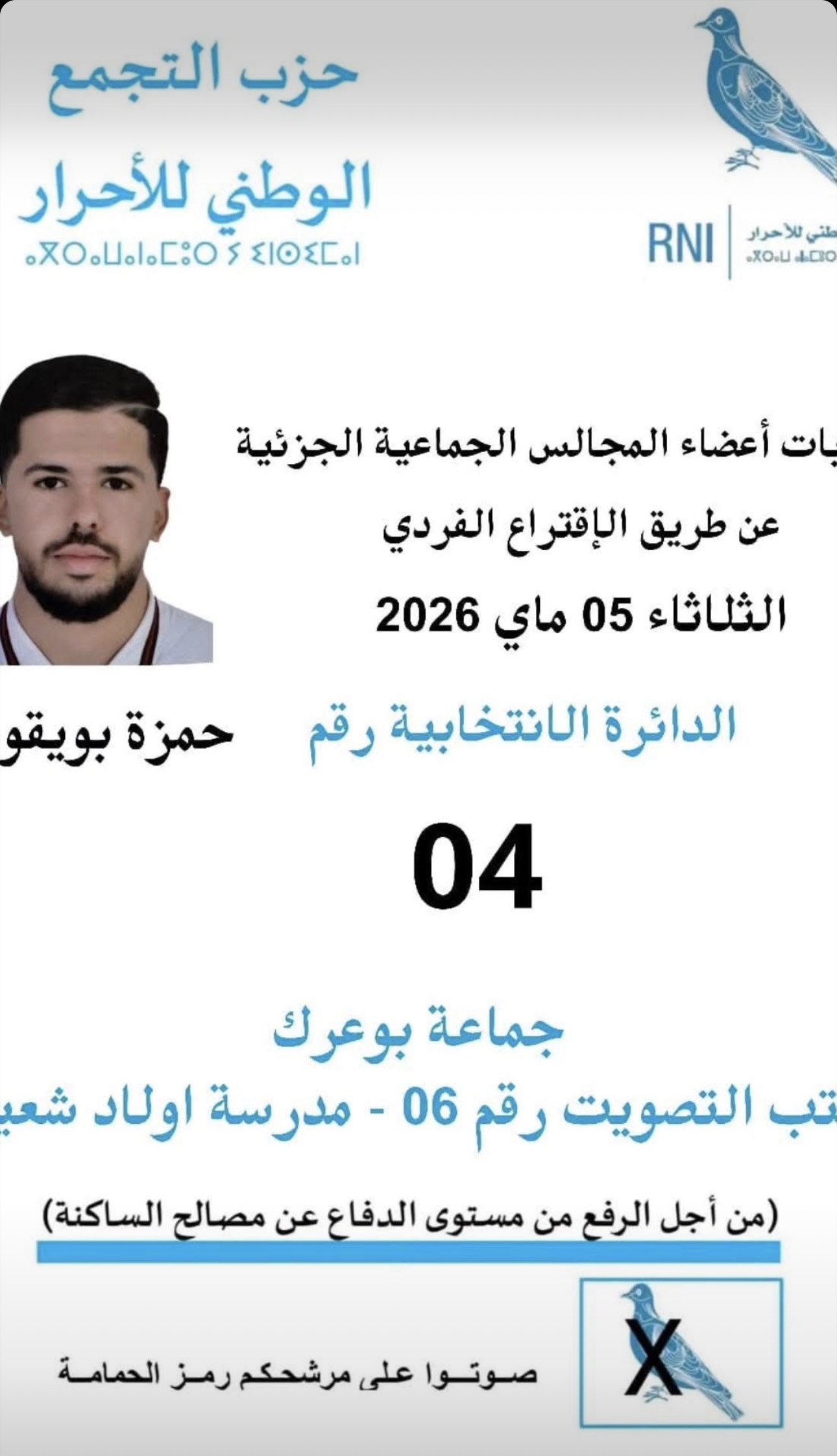ويخوض المرشح هذه الاستحقاقات بالدائرة الانتخابية رقم 04، واضعاً نصب عينيه كسب ثقة الناخبين عبر برنامج عملي وواقعي يستجيب لتطلعات مختلف الفئات، خاصة فئة الشباب التي ترى فيه نموذجاً للأمل والتجديد.